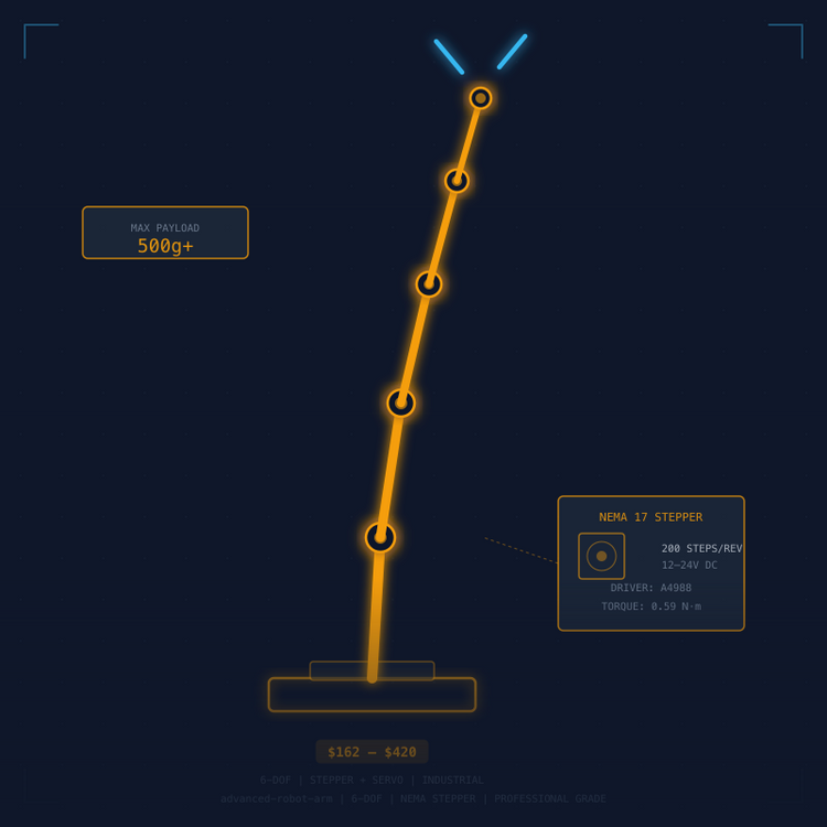 Advanced robot arm kits distinguish themselves from beginner kits in three ways: motor type (stepper instead of servo for open-loop position accuracy), axis count (4–7 DOF for full workspace coverage), and structural rigidity (heavier-gauge aluminum alloy, often with steel hardware). NEMA stepper motors hold their position without active feedback, making them ideal for automation tasks that require repeatable, precise motion sequences. They also offer much higher holding torque than equivalent servo motors.