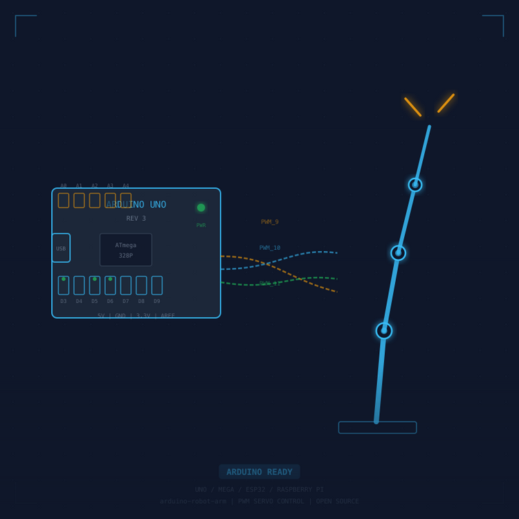 Every Arduino robot arm in our catalog is designed for direct control from an Arduino Uno, Mega, or Nano — no external motor driver required for servo-based kits. Plug servo signal wires into PWM pins, upload the included sketch, and the arm moves on first power-up. Seven of our ten active kits explicitly support Arduino as their primary control platform.