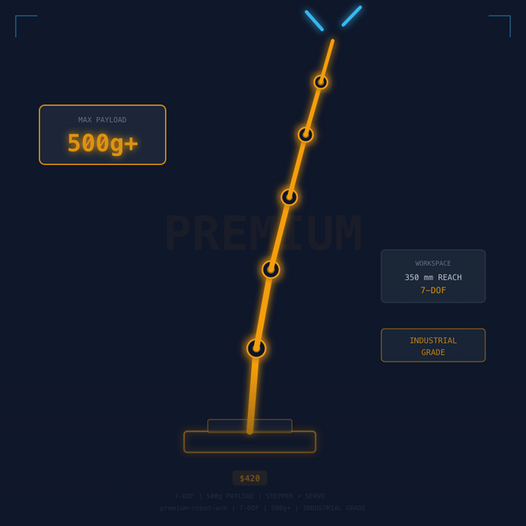 Our professional robot arm kits are built for serious applications — stepper motor precision, 7-DOF redundant kinematics, suction cup end effectors, and heavy-duty aluminum-steel hybrid frames. These kits are used by researchers prototyping automation systems, engineers building custom inspection rigs, and advanced makers who have outgrown servo-based designs. Price range: $162 to $420.