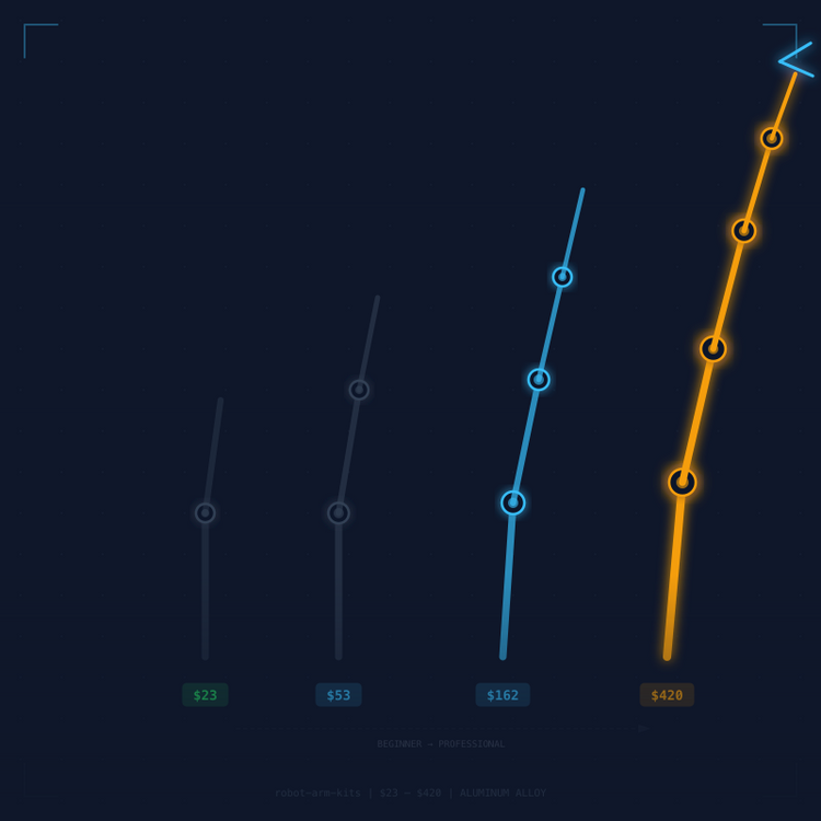Our complete catalog of DIY robot arm kits spans from entry-level 1-DOF grippers at $23 to professional-grade 7-DOF industrial manipulators at $420. Every kit uses CNC-machined aluminum alloy construction and real servo or stepper motors — no plastic, no toy-grade components. Whether you are a first-time builder or an experienced engineer, there is a kit here for your skill level and budget.